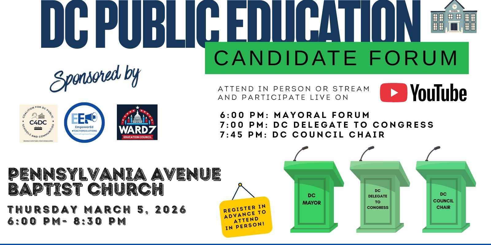 Join the Coalition for DC Public Schools and Communities, EmpowerEd and the Ward & Education Council as we host a candidate forum to explore pressing issues in DC public education ahead of the consequential 2026 DC Primary Elections for Mayor, Council Chair and DC Delegate to Congress. Register here if you'd like to attend in person. You DO NOT need to register if you plan to stream on YouTube. You can submit questions in advance on the registration page here.