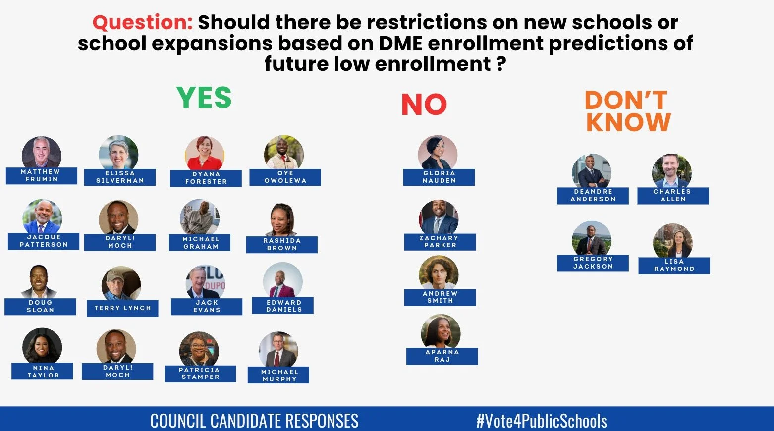 We will elect two at large members for the Council, one to replace Anita Bonds who is not running this time. We sent invitations to all who are on the DC Board of Elections page. We did not receive a replay from: Kevin Chavous, Dwight Davis, Fred Hill, Joe Jackson, Leniqua dominique Jenkins, Candace Tiana Nelson